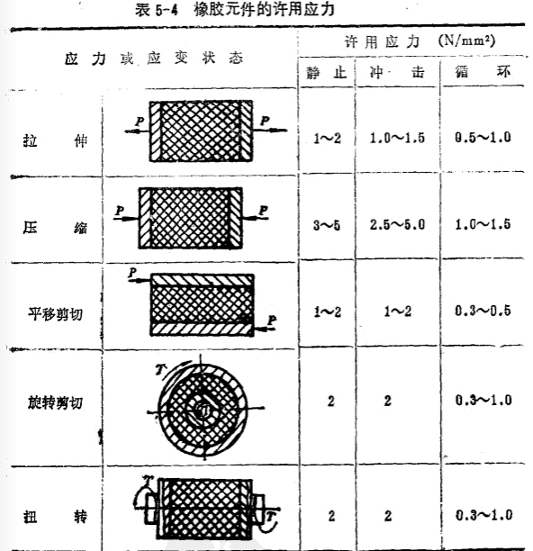 橡膠元件的許用應(yīng)力與橡膠成分,應(yīng)力或應(yīng)變的狀態(tài)及大小等有關(guān),當(dāng)應(yīng)變?cè)?0%左右時(shí),一般可按如下表值選用
