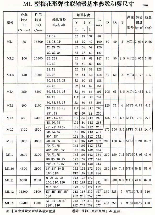 ML系列梅花形彈性聯(lián)軸器的適用范圍和性能特點 1.ML系列梅花形彈性聯(lián)軸器主要由兩個帶凸齒密切嚙合并承受徑向擠壓以傳遞扭矩,當兩軸線有相對偏移時,彈性元件發(fā)生相應的彈性變形,起到自動補償作用。 2.梅花形彈性聯(lián)軸器主要適用于起動頻繁、正反轉、中高速、中等扭矩和要求高可靠性的工作場合,例如:冶金、礦山、石油、化工、起重、運輸、輕工、紡織、 水泵、風機等。工作環(huán)境溫度 -35℃~+80℃,傳遞公稱扭矩25~12500Nm,許用轉速1500~15300r/min。 3.與其它聯(lián)軸器相比,梅花形彈性聯(lián)軸器具有以下特點: (1)工作穩(wěn)定可靠,具有良好的減振、緩沖和電絕緣性能。 (2)結構簡單,徑向尺寸小,重量輕,轉動慣量小,適用于中高速場合。 (3)具有較大的軸向、徑向和角向補償能力。 (4)高強度聚氨酯彈性元件 耐油,承載能力大,使用壽命長, 可靠。 (5)聯(lián)軸器無需潤滑,維護工作量少,可連續(xù)長期運行