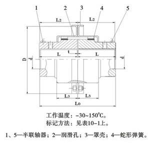 | 型號(hào) | 公稱(chēng)轉(zhuǎn)矩Tn KN.m | 許用轉(zhuǎn)速(n) r/min | 軸孔直徑 d | 軸孔長(zhǎng)度 L | 總長(zhǎng)度 L0 | L2 | L3 | D | t | 重量 kg | 潤(rùn)滑油 kg | 許用位移量 | ||